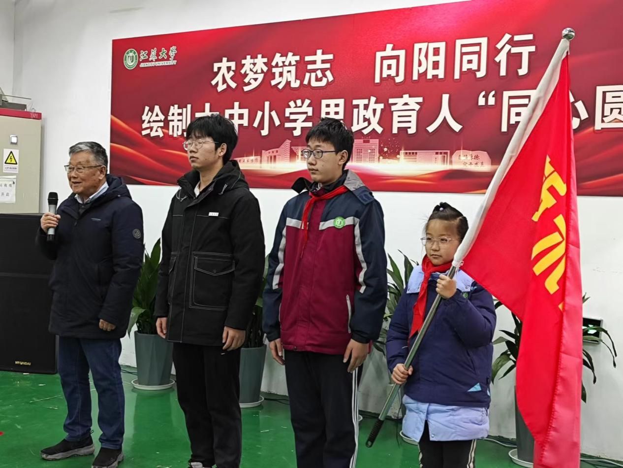 本科生胡超锋等“新禾”先锋队成员代表授旗。赵亚夫寄语“新禾”先锋队的大中小学生们,树立远大的理想,立志成为有情怀、有担当、有创新的新农人。同时,他勉励学生们认真学习专业知识,提高科技素养和创新能力,为农业的发展注入新的活力和动力。