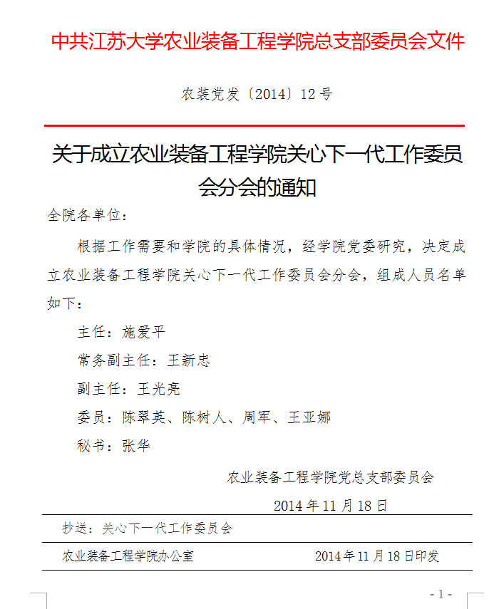 关于成立农业装备工程龙尊娱乐场 关心下一代工作委员会分会的通知