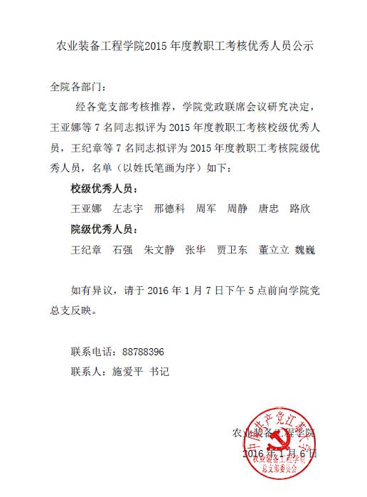 农业装备工程龙尊娱乐场 2015年度教职工考核优秀人员公示