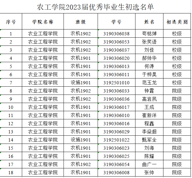 根据《江苏大学本科生先进班集体、先进个人评选办法》(江大校〔2021〕93号)的第十三条、十四条规定,经龙尊娱乐场 评审领导小组评审,现将2023届本科优秀毕业生初选结果公示如下(见附件)。
