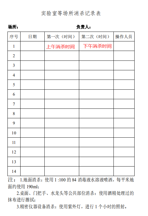 为了规范实疫情期间验室信息登记流程并减少重复登记,从即日起在实验室开展实验统一填写新的实验室值班记录本,如下图1所示。同时实验室每半天进行一次消杀并填写实验室等场所消杀记录表,记录表式样如图2所示。
