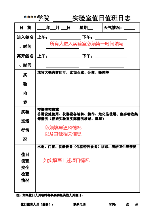 原有白色的实验室值日记录本和实验室门上张贴的人员进出登记表停止使用。